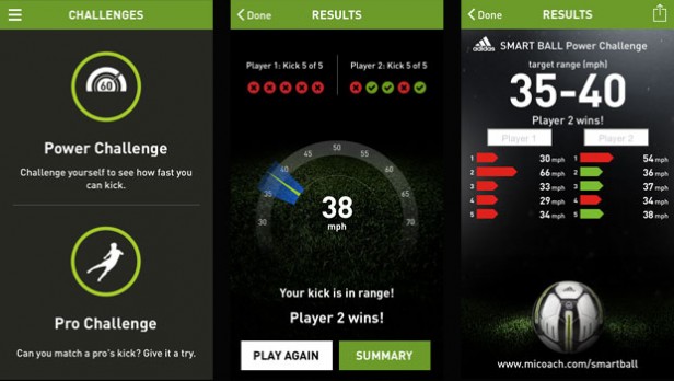 - Adidas miCoach Smart Ball: This device is very similar to the HomeCourt app except instead of using cameras to track the ball, the ball itself is the tracker (and it’s only used for soccer). The ball is capable of recording the impact forces, speed, spin and curve of the ball when it is kicked. And with the help of cameras it knows its position relative to the goal. Similar to the HomeCourt app, it gives the feeling that expensive, sophisticated equipment is being used, and this adds to its value hugely.